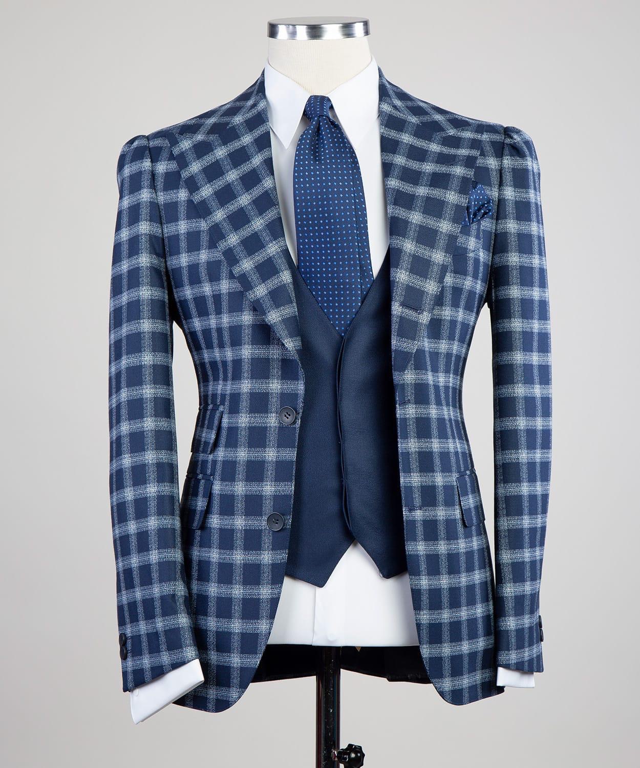 Modèle « Carreau azur napolitain »  Costume 3 pièces, poche droite,  poche ticket droite.
