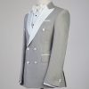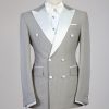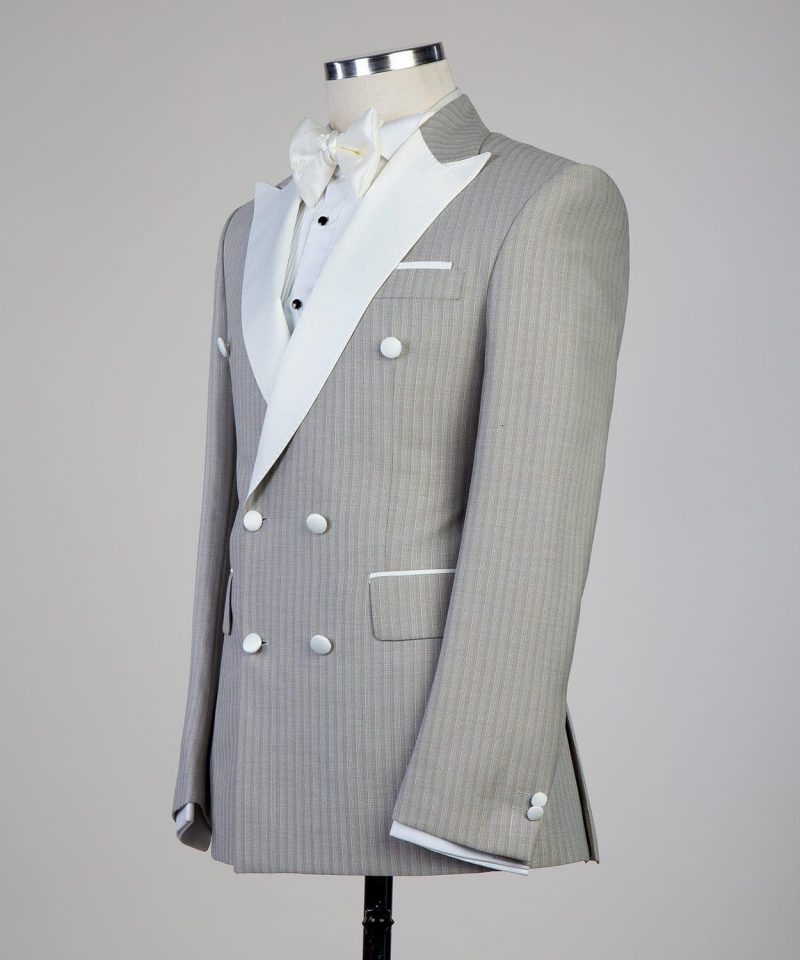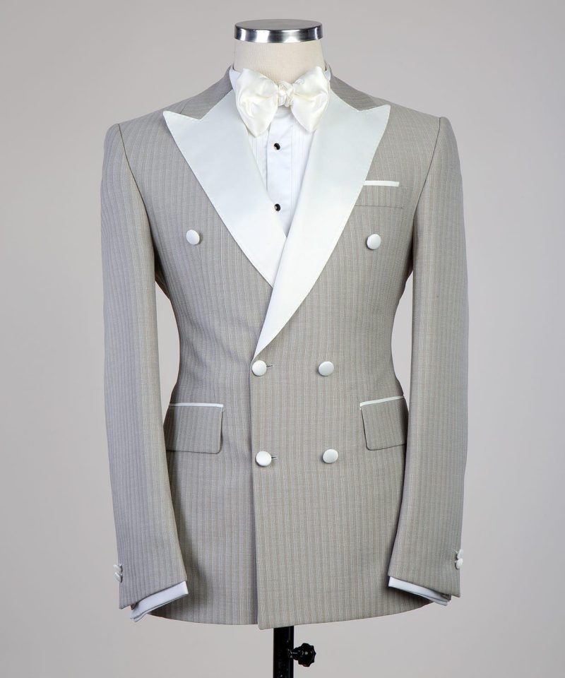 Modèle « Gris blanc » Costume croise 6 boutons, poche droite, revers satin blanc.