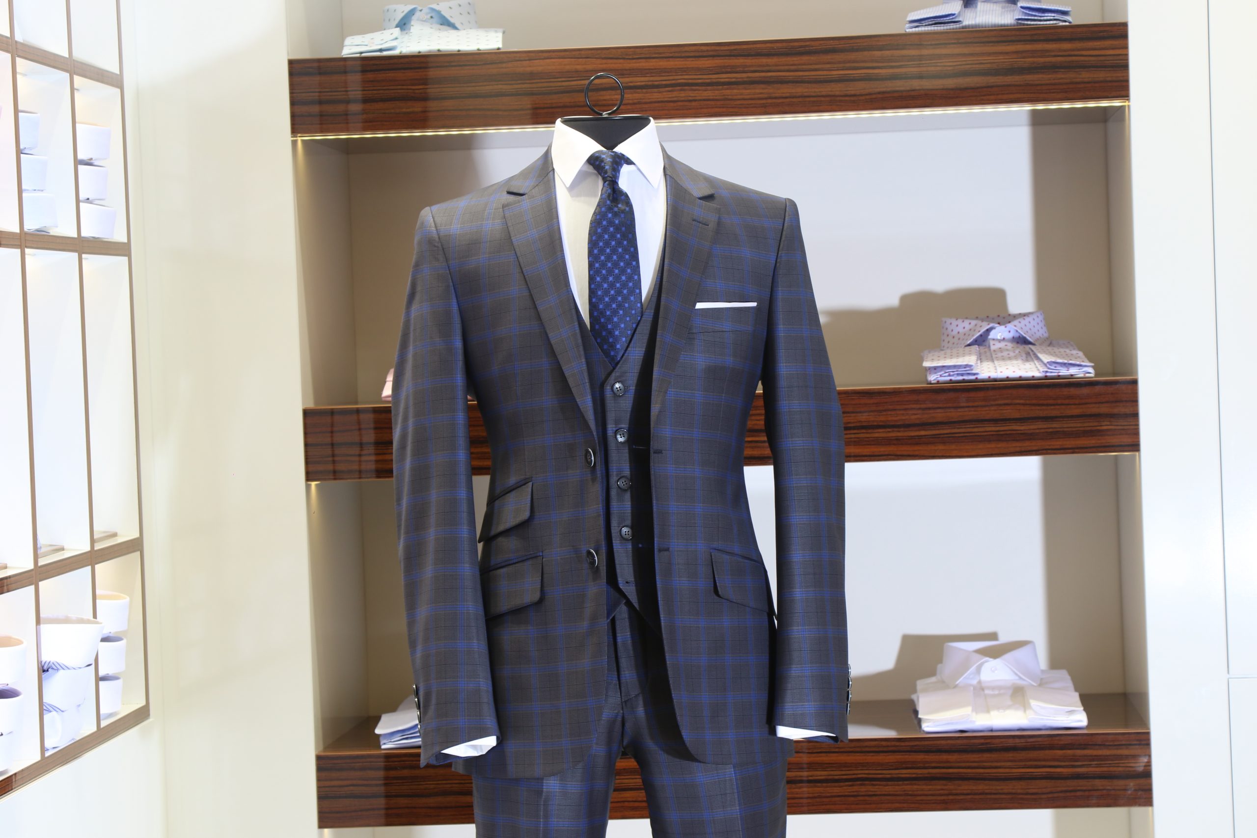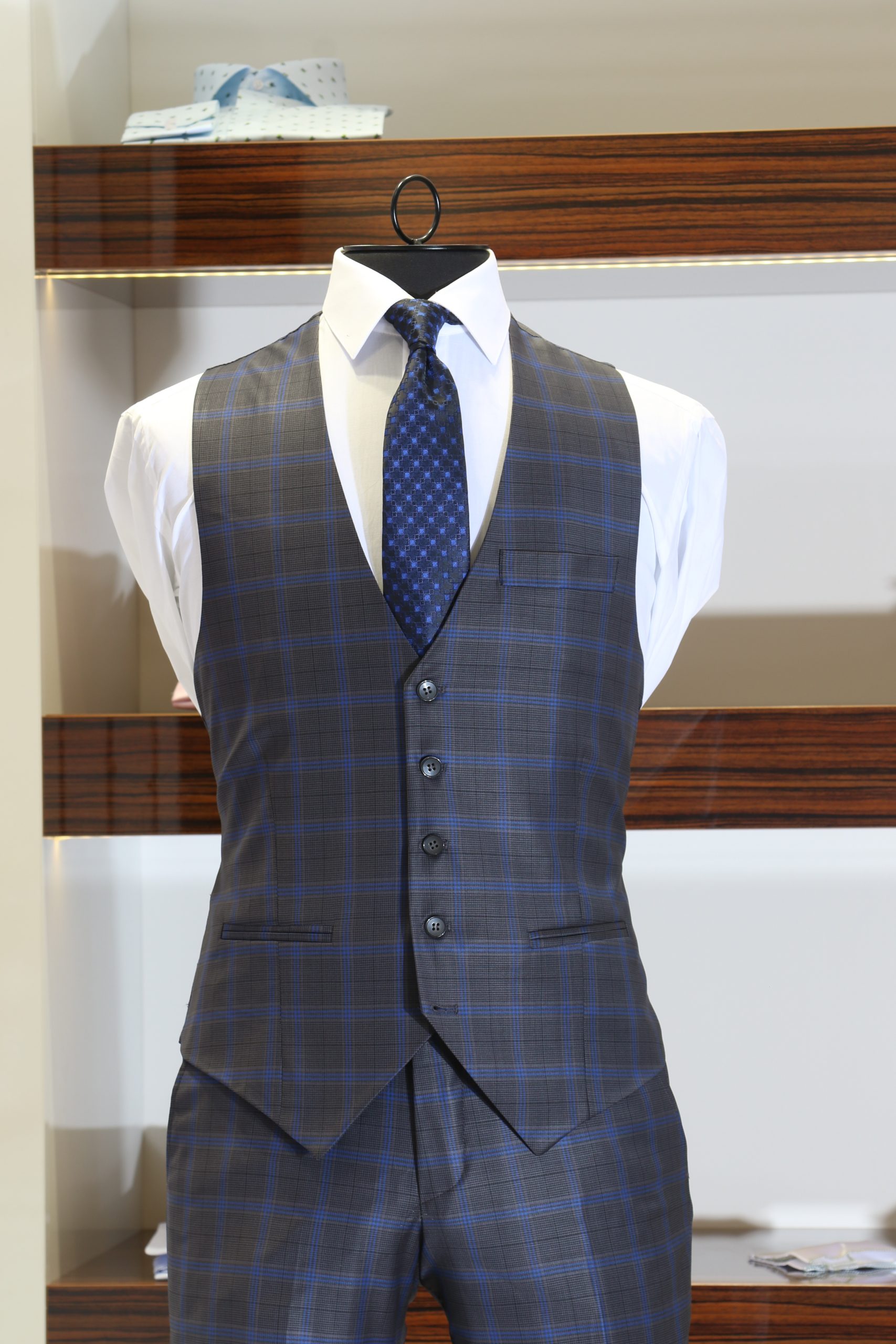 Coupe en demie – mesure Pantalon coupe slim, sans pince & braquette zip, avec passants ceinture Tissu gris souris carreaux bleu roi Laine super 200 s.